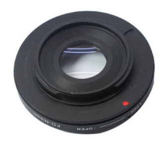 Адаптер Canon FD - Nikon с оптическим элементом предназначен для установки объективов Canon FD на фотоаппараты системы Nikon. Установленный в переходник оптический элемент компенсирует разницу рабочих отрезков, что даёт возможность фокусировки на бесконечность.