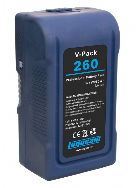 Logocam V-Pack 260 - литий-ионная аккумуляторная батарея с номинальным напряжением 14,4В и ёмкостью 260 Втч (18 Ач), предназначенная для использования с профессиональными видеокамерами SONY DSR-250, DSR-300, DSR-370, DSR-390, DSR-400, DSR-450, DSR-500, DSR-570 и др. Может применяться в качестве замены для батарей SONYcерий BP-L и BP-GL, а так же IDX Endura Li-Ion Batteries E-50, E-50S, E-80S, E-10. Оснащена разъемом PowerTap (AB 2 пин) для подключения внешней нагрузки. Батарея имеет российский сертификат соответствия. |