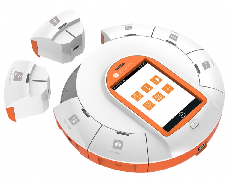 Цифровая лаборатория SenseDisс Advance (Расширенный комплект) Цифровая лаборатория универсальная SenseDisc®Advance Расширенный комплект может использоваться для более сложных естественнонаучных опытов и исследований школьной программы. Например, с ее помощью можно измерить уровень интенсивности шума окружающей среды, исследовать феномен электромагнитной индукции и пр. Встроенные датчики: Акселерометр (3 оси), GPS, Термометр окружающей среды, Барометр. Съемные измерительные датчики: Давление воздуха, Ток, Движение, Температура, Свет, Напряжение, Звук, Проводимость, Растворенный кислород, Сердцебиение, Кислотно-щелочной баланс, Относительная влажность, Термопара, Сила.