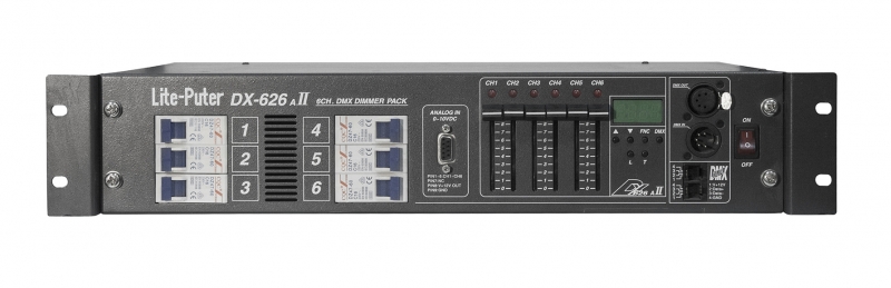 Lite Putter DX-626 — это высокотехнологичный диммерный блок с шестью независимыми каналами. Каждый канал DX-626 обладает линейной зависимостью «выход - уровень управляющего сигнала», что обеспечивает точность и красоту световых эффектов. Диммер обеспечивает выходной ток в 16 ампер на каждый канал. Также Lite Putter DX-626 обладает функцией интеллектуального принудительного охлаждение, она защищает прибор от перегрева и не дает пыли скапливаться внутри корпуса. На передней панели прибора расположены шесть диммерных ползунков, что очень удобно для тестирования. Помимо DMX, оснащен аналоговым входом (0...10 В).