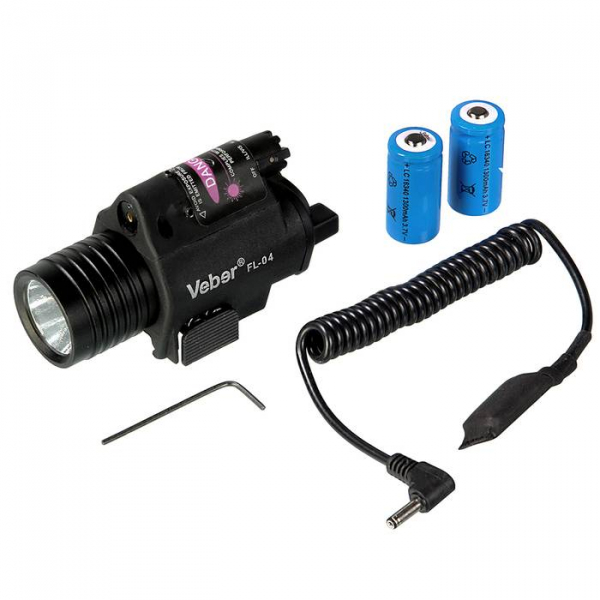 Фонарь подствольный Veber FL-04 с лазером Компактный вариант изделия по принципу 2 в 1. Корпус изготовлен из жесткого пластика, по внешнему виду и прочности даже не отличимым от силумина. Задняя крышка закрывает батарейный отсек, на ней же расположены кнопка включения и гнездо для выносной кнопки (длина шнура — 1 метр). На верхней части корпуса — ручка переключения режимов. Режимы: Выкл, лазер + фонарь, фонарь, лазер. Асферическая поверхность отражателя светодиода фонаря, формирует световой поток с ярким пятном в центре и большой периферийной зоной, что удобно для ориентировки. Оси фонаря и лазера строго параллельны (однако, предусмотрена возможность регулировки направления луча лазера), поэтому при совместном использовании, лазерная точка находится в центре светового пятна от фонаря. Крепление под Weaver. Закрепление устройства осуществляется путем нажатия на подпружиненную площадку прибора в основании корпуса. Обычное (не влагозащищенное) исполнение. Рекомендованное применение — легкая пневматика, пейнтбол, арбалеты и т. п.