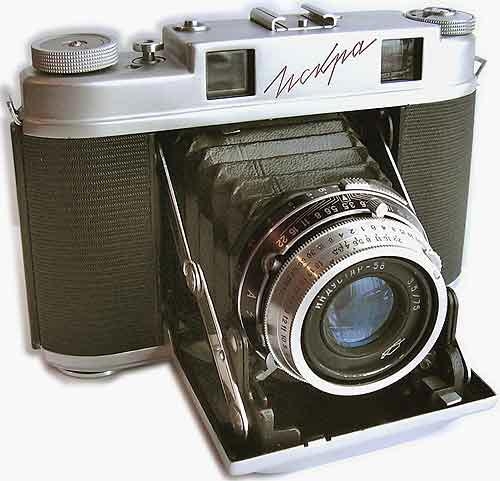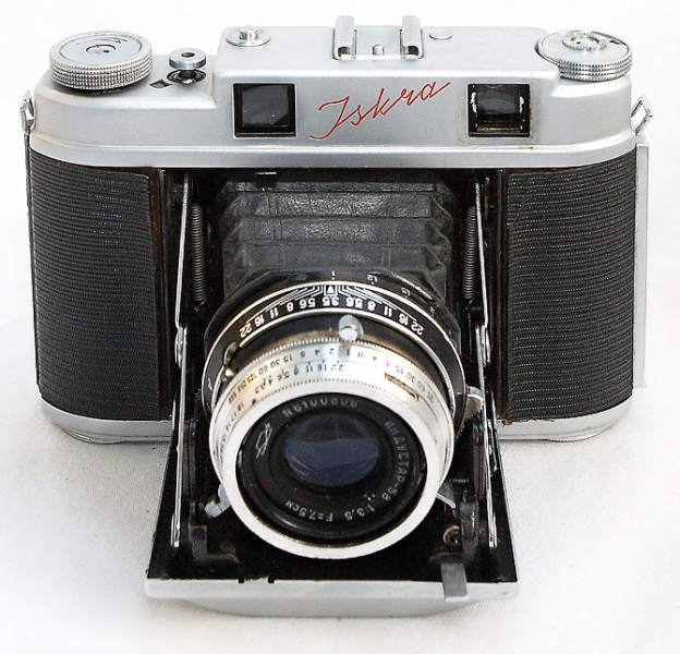 ОписаниеФотоаппарат Искра относится к семейству советских среднеформатных дальномерных фотоаппаратов, который выпускался Красногорским механическим заводом (КМЗ) в период в 1960—1963 гг. Своё наименование эта камера получила по названию подпольной газеты большевиков. Данная модель имеет металлический корпус со съемной задней крышкой, оснащена автоспуском и синхроконтактом, поддерживающим работу, как с импульсными вспышками, так и с одноразовыми. Камера оснащена убирающимся объективом, который соединен с камерой гибким мехом, фокусировка выполняется перемещением всего объектива. Фотоаппарат Искра имеет механический, центральный, междулинзовый затвор (ФЗШ-18), автоматический самосбрасывающийся при перезарядке счетчик кадров. Диапазон выдержек: от 1 до 1/500 с и длительная, видоискатель в данной камере совмещен с дальномером. Характеристики