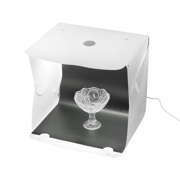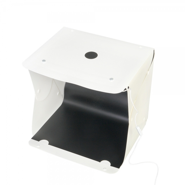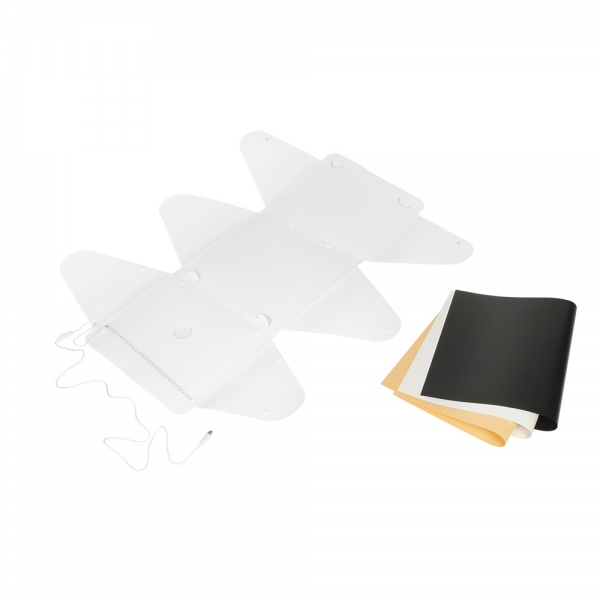 Фотобокс Falcon Eyes Macro Cube 40 LED Складной фотобокс Falcon Eyes Macro Cube 40 LED раскрывает новый уровень возможностей в мобильной фотографии, подходит для съемки небольших предметов и разработан для использования не только с фотокамерами, но и со смартфонами или планшетами. Фотобокс Macro Cube 40 LED позволяет получить снимки со студийным качеством, используя смартфон и простые настройки. Применяется в предметной съемке для интернет-магазинов, печатных рекламных каталогов и т.д. Фотобокс Macro Cube 40 LED является портативной мини-студией и представляет собой белую пластиковую складную конструкцию размером 40x38x36 см и светодиодную ленту на магнитах (25 светодиодов). Фотобокс легко складывается в кейс толщиной 2,5 см, а встроенная ручка делает его удобным для переноски. Перемещая магниты по верхней крышке фотобокса, можно легко отрегулировать положение светодиодной ленты, что позволит выбрать необходимое расположение подсветки без необходимости перемещения объекта съемки. Питание подсветки осуществляется с помощью USB кабеля, подключаемого к сетевому адаптеру или внешнему аккумулятору PowerBank (сетевой адаптер и аккумулятор приобретаются отдельно). В комплект Macro Cube 40 LED входят белый, оранжевый и черный фоны.
