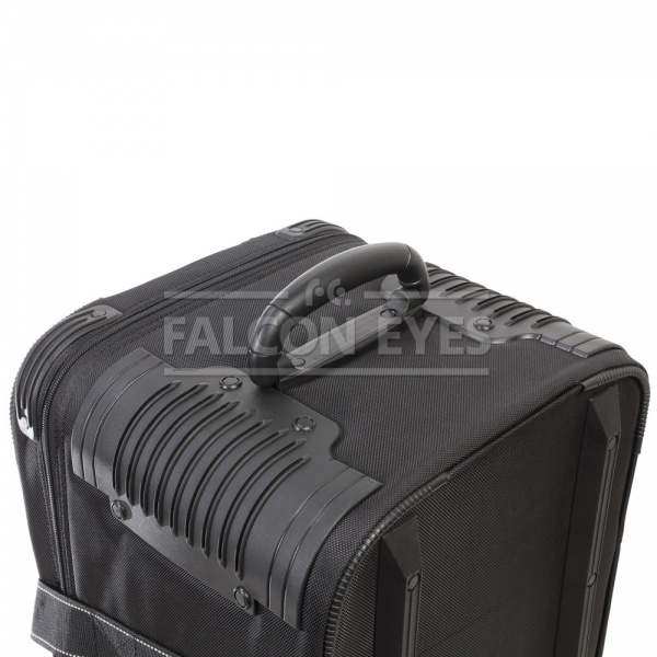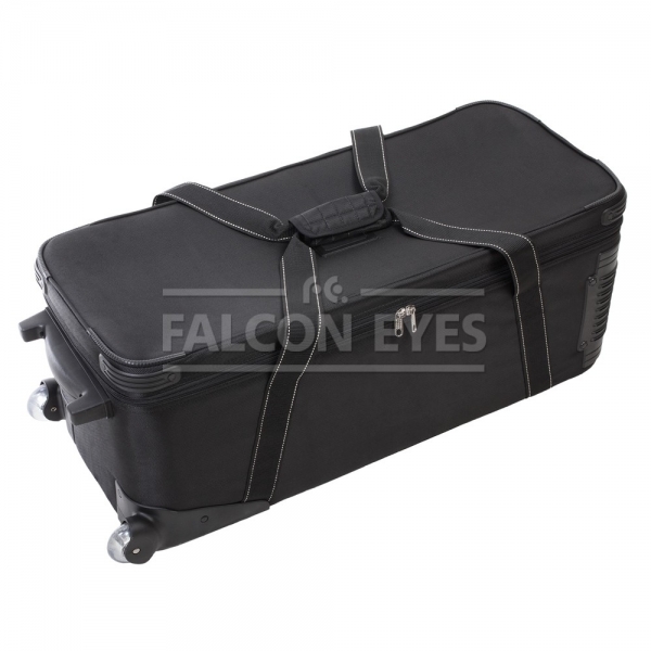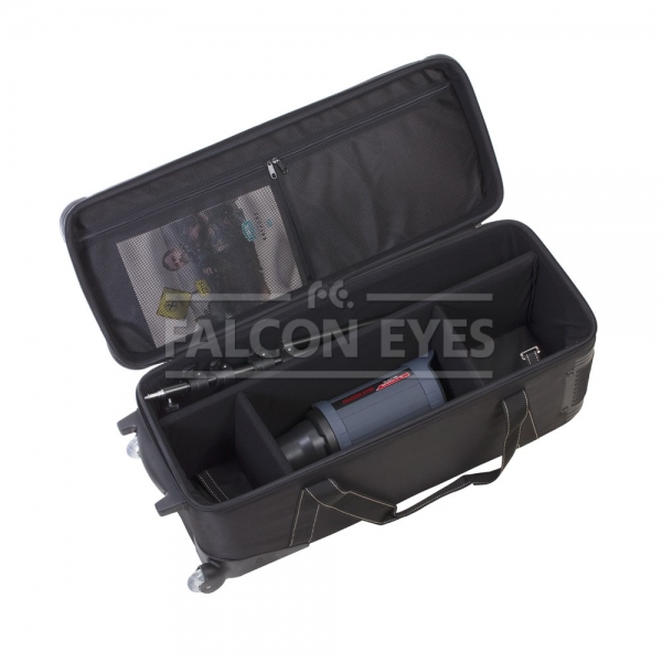 Falcon Eyes CC-16 – сумка с колесами на подшипниках и с жесткими стенками, предназначена для транспортировки и хранения студийного оборудования: комплекта студийных вспышек, стоек и аксессуаров к ним. Сумка изготовлена из прочного синтетического материала, закрывается на застежку-молнию с двумя бегунками. Сумка оснащена регулируемыми жесткими перегородками и стяжками для плотной фиксации. Стенки и дно — жесткие, усилены пластиковыми вставками. Внутри на крышке два прозрачных кармана-сетки на молнии. Крепкие ручки для переноски можно соединить между собой стяжкой на липучке. Широкий наплечный ремень, два колеса на подшипниках, а также пластиковая складная ручка для перевозки обеспечивают максимальное удобство при использовании.