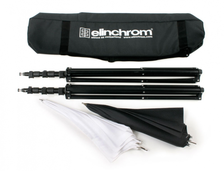 В комплект входит: - стойка 88-235 см2 шт. - зонт просветной 83 см1 шт. - зонт отражающий серебро 83 см1 шт. - кофр для переноски 1 шт. Производителем всех составляющих комплекта является Швейцарская фирма Elinchrom. |