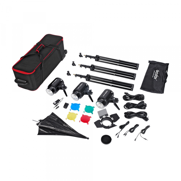 Комплект студийного оборудования Godox E250-D Комплект студийного оборудования Godox E250-D разработан специально для портретной студийной съемки и съемки товаров для интернет-магазинов. Вспышки Godox E250 подходят как для съёмки лиц, поясных портретов, фото на документы, так и для предметной съемки и т. п. Прочная сумка на колёсиках для транспортировки и хранения вмещает весь комплект и снабжена переставляемыми перегородками для организации внутреннего пространства. Моноблок Godox E250 Студийные вспышки Godox E250 отличаются легкостью, компактностью и надежностью. С этим типом вспышек используются студийные аксессуары диаметром 95 мм. Насадки (такие как коническая насадка или набор светофильтров) просто надеваются на переднюю часть вспышки. Более массивные насадки, такие как софтбоксы, оснащены специальным четырехвинтовым поджимным кольцом — за счет чего крепятся надежно и точно не соскользнут под собственным весом. Используя переходное кольцо, можно использовать аксессуары с байонетом Bowens. Корпус моноблока изготовлен из алюминия, байонетное крепление и кронштейн из ударопрочного ABS пластика, все зажимные винты из стали. Наклонный кронштейн поможет надежно закрепить моноблок на стойке, втулка для стоечного пальца изготовлена из алюминиевого сплава. В кронштейне предусмотрено отверстие для установки зонта. Система активного охлаждения вентилятором не даст устройству перегреться при продолжительной работе. Стойка-тренога Godox 304 Стойка-тренога Godox 304 — стойка-тренога с пружинной амортизацией, в комплекте поставляется шаровая миниголовка, предназначена для установки цифровых фото- и видеокамер. Высота от 80 до 183 см, крепежный адаптер диаметром 5/8″ с винтом 1/4″. Пружинный амортизатор предохранит оборудование от повреждения при ослаблении зажимов секций. Винтовые зажимы прочно соединяют секции между собой. Софтбокс SB-MS6060 Софтбокс SB-MS6060 — световой модификатор для студийных осветительных приборов серии E, предназначен для создания мягкого рассеянного освещения без резких теней и бликов. Размер софтбокса 60×60 см. Может использоваться с безбайонетными вспышками с посадочным диаметром до 98 мм любых фирм производителей. Устройство состоит из отражателя, внешнего и внутреннего светорассеивателя, четырёх спиц, хвостовика с винтовой фиксацией. Закрытая конструкция позволяет избежать нежелательных бликов и потерь светового потока. Отражатель, с серебристой тканью внутри, обеспечивает равномерную засветку рассеивателя, который в свою очередь, благодаря большой поверхности, смягчает формируемые тени. Дополнительный внутренний диффузор улучшает равномерность светового потока. Наконечники на упругих металлических спицах не повреждают тканевые спицедержатели софтбокса и облегчают сборку конструкции. Софтбокс имеет ряд преимуществ по сравнению с другими рассеивателями: больше эффективность за счет закрытой конструкции, равномерный по плотности свет. Фотозонт UB-002 84 см серебро/чёрный Серебристая поверхность зонта формирует более жесткий, по сравнению с белыми зонтами, свет, что позволяет получать контрастное изображение с четкими тенями. Прочные спицы из металла и соединительные элементы из ударопрочного пластика для долговечного использования. Ткань из полиэстера обладает высокой износостойкостью. Шторки с набором фильтров BD-03 Ш