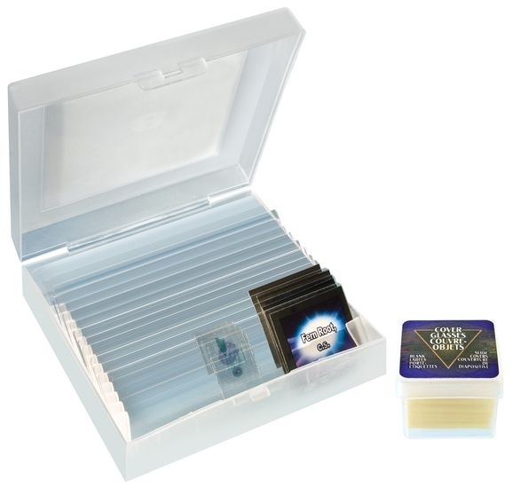 В комплекте с микроскопом поставляется несколько готовых микропрепаратов, которые можно использовать уже «из коробки», кроме того имеются чистые предметные и покровные стекла, которые можно использовать для изготовления собственных микропрепаратов, пинцет и игла.