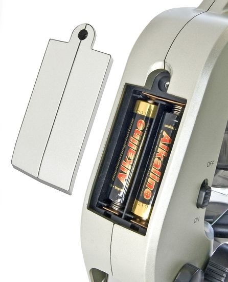 Микроскоп снабжен встроенным светодиодным осветителем, который позволяет работать даже в темном помещении. Осветитель питается от батареек типа АА, что обеспечивает высокую автономность – вы можете пользоваться микроскопом даже при отсутствии электросети, например, если возьмете его с собой в загородную поездку.