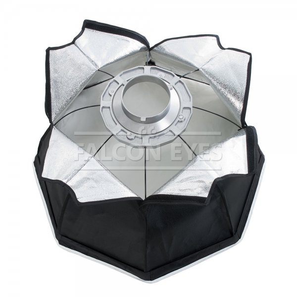 Октобокс Falcon Eyes Устройство включает в себя отражатель, внешний и внутренний рассеиватель, хвостовик с байонетным креплением. Закрытая конструкция позволяет избежать нежелательных бликов и потерь светового потока. Отражатель, с серебристой тканью внутри, обеспечивает равномерную засветку рассеивателя, который в свою очередь, благодаря большой поверхности, смягчает формируемые тени. Дополнительный внутренний диффузор улучшает равномерность светового потока. Наконечники на упругих металлических спицах не повреждают тканевые спицедержатели софтбокса и облегчают сборку конструкции. Установленный на приборе октобокс можно поворачивать на 360 градусов, выбранное положение фиксируется винтом на адаптере. В комплекте чехол для хранения.
