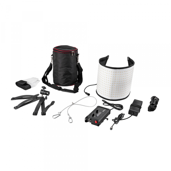 Осветитель светодиодный GreenBean FreeLight 504 bi-color Световая панель Гибкая и ударопрочная панель осветителя FreeLight 504 bi-color позволяет использовать прибор в самых неблагоприятных условиях вне студии. Мощности 504 современных сверхярких SMD светодиодов (CRI более 96) будет достаточно для решения большинства задач съемки. На обратной стороне панели находится кабель (длинной около 60 см) для подключения к модулю управления и «липучка» для крепления светорассеивателя. По углам панели расположены пластиковые ушки для крепления на держателе для установки на стойку. Держатель представляет собой четыре стальных лапки на шаровом шарнире с винтовой фиксацией. Установка держателя на стойку возможна как вертикальном так и в горизонтальном положении. Для этого в основании держателя есть два перпендикулярных отверстия. Внутренний диаметр отверстий под стойку составляет 16 мм. Фиксация держателя на стойке — винтовая. Для получения мягкого светового потока в комплекте предусмотрен светорассеиватель из синтетического полупрозрачного материала. Крепление рассеивателя производится за счёт «липучки» велкро на обратной стороне панели. По периметру рассеивателя находится светоотражающие «серебряное» покрытие. Модуль управления Модуль управления изготовлен из прочного алюминиевого сплава. На лицевой стороне находится два валкодера для изменения яркости и цветовой температуры и дисплей, отображающий текущие параметры яркости, цветовой температуры и оставшийся уровень заряда аккумулятора. Яркость светодиодов с разной температурой можно регулировать отдельно (вход в режим производится нажатем валкодера «Color»). На обратной стороне крепление аккумуляторов V-mount, с правой стороны: тумблер питания со встроенным индикатором работы и гнездо для подключения блока питания. Для установки модуля на стойке, на его корпусе предусмотрены два металлических ушка. Установка осуществляется с помощью комплектного металлического тросика в пластиковой оболочке, на концах которого предусмотрены два металлических карабина. Модуль управления может быть размещен на самой панели при помощи липучек, либо отсоединен от нее для облегчения веса. Во втором случае управляющий сигнал мощностью светового потока и цветовой температурой передается по специальному кабелю, входящему в комплект. Питание модуля управления возможно как аккумуляторов V-mount (в комплект не входят), так и от сети 220 В, с помощью комплектного блока питания. Сумка для хранения и транспортировки Для хранения и транспортировки в комплекте с осветителем предусмотрена сумка с чехлом, изготовленные из прочного синтетического материала. Клапан сумки закрывается на молнию. Для переноски предусмотрен наплечный регулируемый ремень