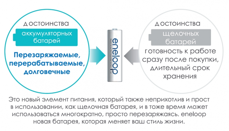 Eneloop – это экологичные аккумуляторы нового поколения, которые предпочли более чем в 60 странах мира в качестве очередного этапа на пути от одноразового к многоразовому использованию вещей.