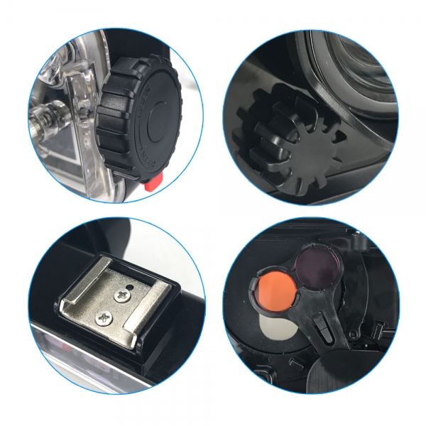 Три штативных гнезда снизу бокса, а также крепление типа "холодный" башмак, позволяет крепить рукоятки и армов для подводных фонарей. Также бокс может использоваться, как защитный чехол для вашего смартфона.