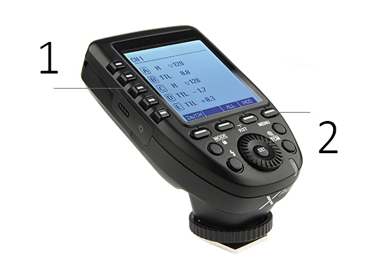Большой ЖК дисплей, 5 кнопок групп и 4 функциональных кнопки обеспечивают удобство манипуляций. Кнопки групп (1), Функциональные кнопки (2) Обновление прошивки через USB разъем типа С. Беспроводная синхронизация через гнездо для синхрокабеля 2,5мм. USB разъем тип C (1), Гнездо для синхрокабеля 2,5мм (2) *2 батарейки АА Большая портативность Xpro-S – его вес всего 80 г.