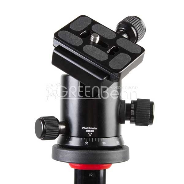 PhotoMaster 601 BH имеет съемную шаровую головку, с надежной системой фиксации и является одним из самых функциональных на сегодняшний день. Конструкция штатива выдерживает нагрузку до 15 кг. Секции ног имеют большой диаметр, что предотвращает дрожание и вибрации. PhotoMaster 601 BH имеет широкие возможности регулировки угла съемки для различных ситуаций, в том числе для низкого угла съемки (каждая нога имеет три ступени регулировки угла). Прочные и надежные цанговые зажимы добавляют конструкции жесткость. Платформа под штативную голову, диаметром 60 мм, комплектуется реверсивным винтом диаметром 1/4" и 3/8". Отдельно стоит отметить мультипозиционную центральную колонну, которая может поворачиваться вокруг своей оси, наклоняться сверху вниз и может быть зафиксирована в любом положении. Это позволяет регулировать положение колонны на 360 по горизонтали и 180 по вертикали. Штативная головка, идущая в комплекте, отличается своей компактностью, легкостью и в то же время большой грузоподъемностью. Головка регулируется в соответствии с весом фотокамеры и центром тяжести благодаря скользящей площадке с ходом 27 мм. Шкала нанесенная на основание головы позволяет использовать её для панорамной съемки. На корпусе имеются 4 рукоятки управления, каждая из которых отвечает за определенную задачу: винт быстрой фиксации шара штативной головки, винт регулирующий силу трения шара штативной головки, винт фиксации панорамного вращения и винт фиксации площадки. Конструкцией предусмотрены два пузырьковых уровня, позволяющих выровнять камеру при горизонтальном и вертикальном положении кадра.
