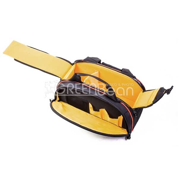 Сумка предназначена для транспортировки и хранения камкордера небольшого размера и дополнительного оборудования. Изготовлена из устойчивого к климатическим воздействиям нейлона с защитным вспененным наполнителем, внутренние стенки из вельвета яркого оранжевого цвета, на фоне которого не затеряются даже самые мелкие предметы. По периметру сумки располагаются ребра жесткости. Двухстворчатая крышка с предохранительным замком для быстрого доступа к камере. Металлические язычки молний снабжены удобными нейлоновыми петлями. Широкая лямка распределяет нагрузку на плече и обеспечивает комфортную эксплуатацию. Удобные ручки со стяжкой. Основной отсек для техники имеет перегородки на липучках, благодаря этому пространство внутри рюкзака можно настроить под оборудование. Внешний боковой отсек с жесткой крышкой позволит разместить необходимые аксессуары.