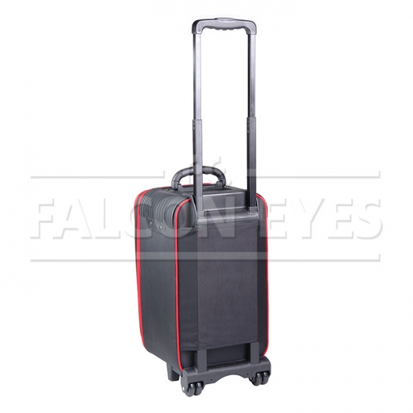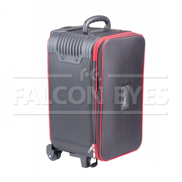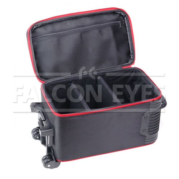 Falcon Eyes CC-18 – сумка с колесами, жесткими стенками и выдвижной ручкой, предназначена для транспортировки и хранения студийного оборудования: комплекта компактных студийных вспышек и аксессуаров к ним. Сумка оснащена двумя регулируемыми перегородками. Стенки и дно — жесткие, ребра усилены пластиковыми вставками. Внутри на крышке прозрачный карман-сетка на молнии. Внутренний объем можно увеличить благодаря функции расширения, для этого на крышке предусмотрена дополнительная молния. Два колеса и выдвижная ручка обеспечивают максимальное удобство при транспортировке оборудования. Сумка изготовлена из прочного синтетического материала, закрывается на застежку-молнию с двумя бегунками.