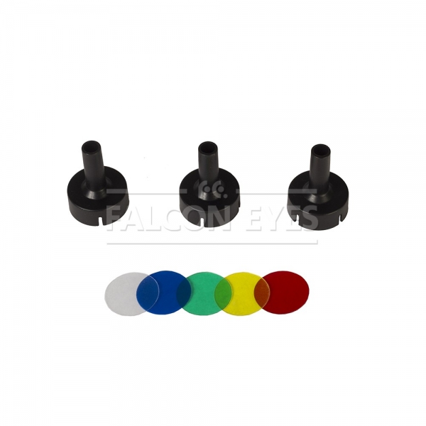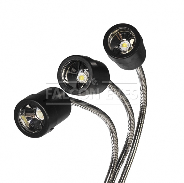 Falcon Eyes DV-3B — накамерный светодиодный осветитель для точечной подсветки, предназначен для использования в макросъемке . Осветитель состоит из 3-х отдельно регулируемых ламп-светодиодов мощностью 1 Вт каждая. Светодиоды закреплены на длинных гибких металлических штангах. Блок управления (основание) устанавливается на камеру с помощью крепления «холодный башмак», башмак снизу имеет бронзовую вставку с резьбой 1/4 дюйма для установки осветителя на штатив. С помощью 3-х ручек производится независимая плавная регулировка яркости каждого светодиода от 0 до 100%, а также включение/отключение питания. Угол освещения регулируется от 53° до 120°, в комплекте насадки для создания направленного узкого потока света. С помощью гибких штанг длиной 330 мм можно легко перемещать диоды в любое положение для достижения требуемого эффекта освещения. Для создания цветовых эффектов применяются сменные светофильтры из комплекта. В качестве элементов питания используются 4 батареи типа АА или соответствующие аккумуляторы (не входят в поставку).