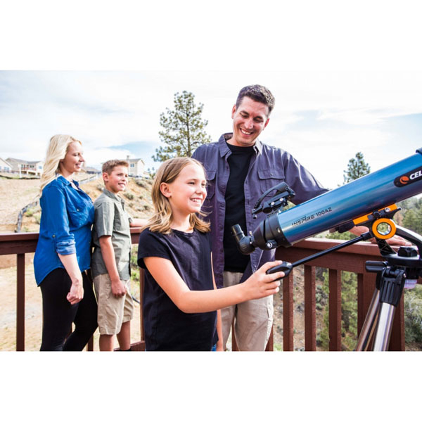 Телескоп Celestron Inspire 100AZ Inspire 100 AZ - это телескоп-рефрактор, который идеально подходит не только для астрономических наблюдений, но и для наблюдений за наземными объектами. С помощью телескопа Inspire100 AZ вы увидите планеты Солнечной системы, Луну, звездные скопления, яркие туманности и галактики. Такие как: Туманность Ориона и Туманность Андромеды. А с помощью оборачивающей призмы вы сможете использовать телескоп днем как мощную зрительную трубу. Подготовить телескоп к наблюдениям вы сможете в считанные минуты. Даже на первую сборку телескопа у вас уйдет минимальное время без использования дополнительных инструментов. А выдвижные ножки штатива позволят вам устанавливать телескоп не только на земле, но и даже на столе. Набор аксессуаров входящий в комплект поставки позволит вам сразу начать наблюдения. Азимутальная монтировка Азимутальная монтировка оснащена удобной ручкой с помощью, которой вы легко наведете телескоп на интересующий вас объект. Аксессуары В комплект поставки телескопа Inspire 80 AZ входит: два окуляра (20 и 10 мм), оборачивающая призма 90°, адаптер для смартфона встроенный в крышку объектива, видоискатель StarPointer Pro и красный светодиодный фонарик. С помощью двух окуляров вы сможете рассмотреть объект в телескоп с разными увеличениями. Оборачивающая призма 90° очень удобна для наблюдения за небесными объектами, которые находятся высоко над горизонтом, а также позволит вам наблюдать наземные объекты в прямом а не в перевернутом виде. Искатель StarPointer Pro очень удобен для наведения телескопа на интересующие вас объекты. Достаточно двигая трубу телескопа, совместить красную светящуюся точку видоискателя с предполагаемым объектом наблюдения, как этот объект попадет в поле зрения телескопа. Красный фонарик вам поможет осветить место вашего наблюдения, а также карты и свои записи, не испортив адаптацию ваших глаз к темноте. Адаптер для смартфона позволит вам сфотографировать небесные объекты, например кратеры на Луне или наземные объекты, такие например, как птиц и животных.
