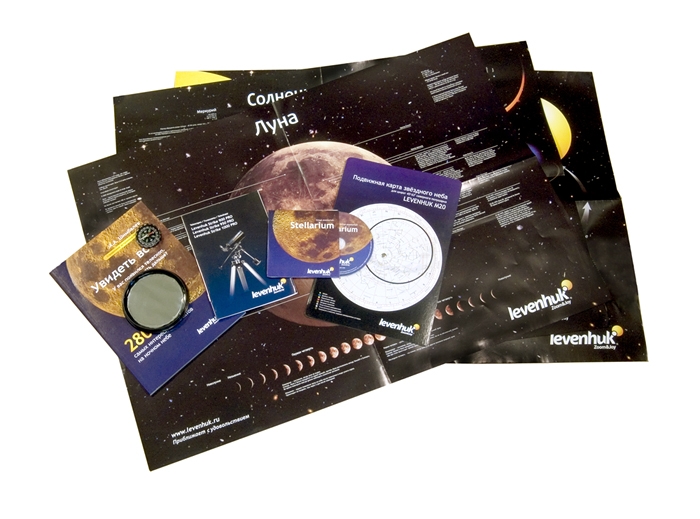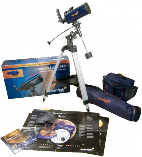 Телескоп Levenhuk Strike 1000 PRO – «старшая» модель серии Strike PRO для опытных пользователей. Этот телескоп одинаково хорошо подходит и для планетных наблюдений, и для наблюдений за объектами дальнего космоса. Его 102-миллиметровый объектив собирает большое количество света (на 23% процента больше, чем объектив 90 мм) и способен показать объекты до предельной звездной величины 12,0. С ним вам станут доступны далекие туманности, галактики, звездные скопления и многое другое. Фокусное расстояние в 1300 мм идеально подойдет для подробного изучения поверхности Луны и дисков планет. Относительно небольшие габариты и малый вес прибора позволят часто вывозить его на природу для наблюдений под темным загородным небом, где телескоп раскроет все свои возможности в полной мере. Телескоп Levenhuk Strike 1000 PRO непременно оценят опытные астрономы. Легкая труба телескопа установлена на экваториальную монтировку немецкого типа EQ2, оборудованную ручками тонких движений. Экваториальная монтировка требует предварительной настройки, но при этом она намного удобнее при слежении за объектами, в отличие от азимутальной. Она имеет специальные координатные круги, которые помогут найти объекты по их экваториальным небесным координатам, а также позволит сопровождать суточное движение объекта вращением только одной ручки. При желании вы можете самостоятельно дополнительно оснастить монтировку электроприводом часовой оси. Монтировка установлена на устойчивую регулируемую по высоте треногу с полочкой для аксессуаров. Превосходное качество оптики для максимальных результатов. Объектив с апертурой 102 мм способен собрать достаточное количество света для получения ярких изображений космических объектов, а специальное покрытие оптики обеспечивает максимальное светопропускание и делает результирующую картинку четкой и контрастной. Фирменные окуляры, входящие в комплект поставки, также изготовлены с максимальной тщательностью и точностью и помогут вам значительно расширить использование телескопа. При подключении фотокамеры вы сможете не только проводить визуальные наблюдения, но и делать удивительные астрофото. Фокусировочное устройство имеет стандартную Т-резьбу, которая позволит при помощи специального переходного кольца (приобретается отдельно) установить на телескоп зеркальную фотокамеру. Уникальная сверхширокая дополнительная комплектация телескопов Strike PRO. Такого вы еще не видели! Данная серия телескопов включает в себя не только стандартные аксессуары серий Strike (печатные материалы, набор сменных окуляров, компас, программу-планетарий), но и дополнительные аксессуары, которые помогут использовать телескоп на полную мощность: окуляр Plössl 6,3 мм, 2х-кратую линзу Барлоу, набор цветных фильтров, солнечный и лунный фильтры, а также фирменную сумку для переноски телескопа Levenhuk Zongo 60. Сам телескоп Levenhuk Strike PRO упакован в картонную коробку привлекательной яркой расцветки. Такая комплектация не имеет аналогов на рынке и делает телескопы Levenhuk Strike PRO особенно привлекательными для тех, кто планирует перейти на новую ступень в своих наблюдениях! Эта невероятно широкая комплектация позволит вам погрузиться в таинственный и загадочный космос сразу же после покупки