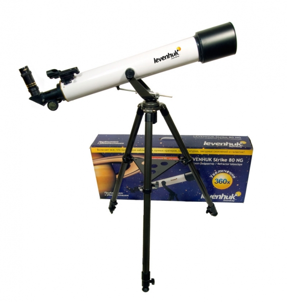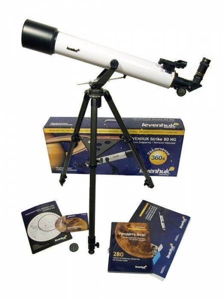 Старшая модель серии Levenhuk Strike 80 NG, которая отличается большими оптическими возможностями. Это рефрактор-ахромат на легкой азимутальной монтировке, который хорошо подойдет для начинающих любителей астрономии любого возраста. Благодаря не имеющей аналогов богатой комплектации, включающей все необходимое для проведения наблюдений, будет отличным подарком для любознательного подростка. В этот телескоп можно рассмотреть множество деталей на лунной поверхности (кратеры и другие детали поверхности крупнее 5 километров), кольца Сатурна, облачные пояса и спутники Юпитера, фазы Венеры, яркие кометы, туманности и галактики, множество двойных и кратных звезд, звездных скоплений и других интересных объектов. Levenhuk Strike 80 NG — это самая мощная модель из серии телескопов для детей (впрочем, эти телескопы пользуются популярностью и у взрослых новичков). Увеличение в 360 крат позволит вам и вашему ребенку рассмотреть детали лунного пейзажа, увидеть щель Кассини в кольцах Сатурна, полярные шапки Марса и другие планеты Солнечной Системы. Объектив 80 мм собирает больше света, чем младшие модели серии и позволяет добиться проницающей способности в 11,5 m (предельная звездная величина). Это значит, что вы сможете оценить неописуемую красоту туманности Ориона, увидите голову Медузы Горгоны в созвездии Персея и множество других объектов глубокого космоса, включая Туманность Андромеды. Вам не потребуется долго и мучительно разбираться со сборкой и настройкой телескопа. Это простейший рефрактор, который устанавливается на азимутальную монтировку (самый простой и удобный тип монтировки) и готов к использованию практически сразу после распаковки. Более того, это не просто телескоп — это целый подарочный набор. В нём есть всё, что необходимо начинающему наблюдателю. Даже ребенок сможет быстро разобраться и научиться пользоваться телескопом. Для этого в комплект входят: Цветная иллюстрированная книга «У вас появился телескоп. Что делать дальше?». С её помощью вы и ваш ребенок научитесь основам астрономических наблюдений. Азы астрономии даны в простом и компактном виде. Набор постеров. Это очень полезные для юного астронома наглядные «шпаргалки» с основными сведениями о самых значимых космических объектах: планеты Солнечной Системы, Луна, Солнце и другие звезды. Планисфера — это карта звездного неба, по которой вы узнаете, какие звезды вы можете увидеть на ночном небосклоне сегодня. Для этого выберите нужную дату и вы увидите, какие объекты доступны для наблюдения. Виртуальный 3D-планетарий. Это компьютерная программа Stellarium, которая создаёт реалистичное небо в режиме реального времени. Вы увидите объёмные панорамы и пейзажи: планеты Солнечной Системы, Луну, далёкие туманности и галактики — всего более 600 тысяч объектов. Всё это упаковано в яркую подарочную коробку.