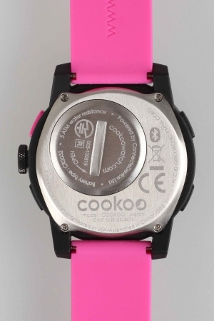 - Нижняя часть Cookoo Watch выполнена из металла, такая конструкция устройства позволяет выдерживать давление в 5 атмосфер, кроме того, водонепроницаемый корпус позволяет в этих часах даже плавать;