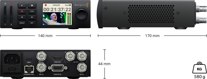 Видеорекордер HyperDeck Studio Mini Самая компактная вещательная Ultra HD-дека для записи и воспроизведения с 10-битным качеством, двумя слотами для карт SD/UHS-II и поддержкой протокола FTP. Вещательная дека HyperDeck Studio Mini имеет настолько компактные размеры, что ее можно взять с собой в абсолютно любое место. Несмотря на малый форм-фактор, она позволяет записывать и воспроизводить 10-битное видео в виде файлов ProRes с использованием доступных карт памяти SD и UHS-II. Устройство имеет интерфейс 6G-SDI с поддержкой всех форматов вплоть до 2160p/30, разъем HDMI 2.0 для мониторинга, два слота для накопителей и синхровыход со встроенным генератором опорного сигнала для работы с последовательным подключением. Двухканальный выход 6G-SDI обеспечивает раздельный вывод материала в 720 или 1080 HD (4:4:4:4) для кеинга. HyperDeck Studio Mini оснащается встроенным блоком питания, а также портами RS-422 для удаленного управления и PoE+ для передачи данных по протоколу FTP. Широкий функционал. Запись и воспроизведение с вещательным качеством HyperDeck Studio Mini идеально подходит для сохранения мастер-копии во время многокамерной съемки или записи отдельного сигнала для последующего монтажа. Деку также можно использовать для вывода готового материала непосредственно в эфир или на широкоэкранный телевизор с HDMI-интерфейсом. Благодаря функции синхронизации несколько таких устройств будут обеспечивать безупречную передачу изображения на цифровые панели высокого разрешения. В конфигурации с микшером этот мини-рекордер также позволяет накладывать вещательную графику вместе с альфа-каналом поверх живого видео в режиме реального времени! Прочный и стильный корпус. Полнофункциональная дека с исключительно малым форм‑фактором HyperDeck Studio Mini имеет два слота для карт памяти, набор разъемов профессионального уровня, порт Ethernet и встроенный блок питания, при этом ширина корпуса составляет всего 140 мм. Если нужно создать собственную конфигурацию оборудования с другими устройствами, для установки используют полку Teranex Mini Rack Shelf. Так, для работы с аналоговым материалом достаточно добавить конвертер Teranex Mini Analog to SDI на входе и Teranex Mini SDI to Analog на выходе, а вывод одного сигнала на восемь интерфейсов обеспечит модель Teranex Mini SDI Distribution 12G. Деку также можно поместить на стол или любую другую подходящую поверхность. Это самое гибкое решение с функционалом профессионального рекордера! Разъемы профессионального уровня. 6G-SDI для SD, HD и Ultra HD Благодаря разъемам 6G-SDI решение совместимо с любыми камерами, мониторами и SDI-коммутаторами, поддерживая все разновидности SD-, HD- и Ultra HD-форматов вплоть до 2160p/30. Предусмотрены SDI-вход, синхровход и два SDI-выхода, которые можно использовать для двухканального вывода изображения или кеинга. Наличие интерфейса HDMI обеспечивает подключение рекордера к широкоэкранным телевизорам, цифровым проекторам и другой технике. Кроме того, есть порты RS-422 для удаленного управления и Ethernet для загрузки файлов из локальной сети, а также встроенный блок питания 110-240 В. В комплект поставки входит пакет SDK и руководство по эксплуатации с описанием протокола, который позволяет интегрировать HyperDeck Studio Mini с другим оборудованием и программными продуктами. Привычный интерфейс управления. Простой и понятный рабочий процесс HyperDeck Studio Mini имеет традиционные для видеомагнитофона органы управления, в том числе кнопку перемот