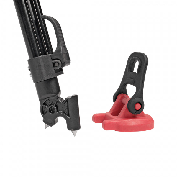 Ножки штатива вилочного типа. Секции ног надежно фиксируются клипсовыми замками. При ослаблении клипсового фиксатора — возможна регулировка зажима винтом (винтами) с обратной стороны клипсы. На концах штативных ног размещены парные шипы, на которые надеваются резиновые "башмаки". Таким образом, можно выбрать необходимый тип опоры для различных условий съемки. Шипы используются вне помещений, например для устойчивости на грунте или на льду, а резиновые опоры обеспечивают отличное сцепление на скользких и гладких поверхностях для защиты поверхности пола от царапин и повреждений. Для усиления штатива используется верхняя съёмная растяжка, которая не позволяет ногам разъезжаться и обеспечивает быстрое затухание колебаний. В комплекте предусмотрена съёмная нижняя телескопическая растяжка, применяемая на ровных поверхностях. Размах растяжки варьируется от 88 до 132 см.